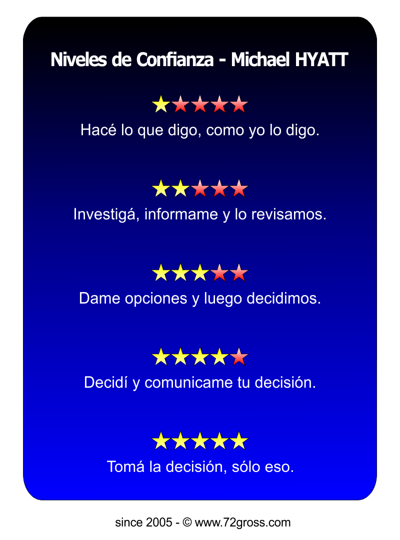Estos niveles reflejan el nivel de confianza con el que se delega, verbaliza la confianza en las habilidades, experiencia y responsabilidad de la persona en quien se delega. Se puede ver como un proceso en el que se vá escalando en el grado de libertad según se vaya adquiriendo habilidades y experiencia. Facilita un crecimiento gradual hacia una confianza plena durante el proceso.